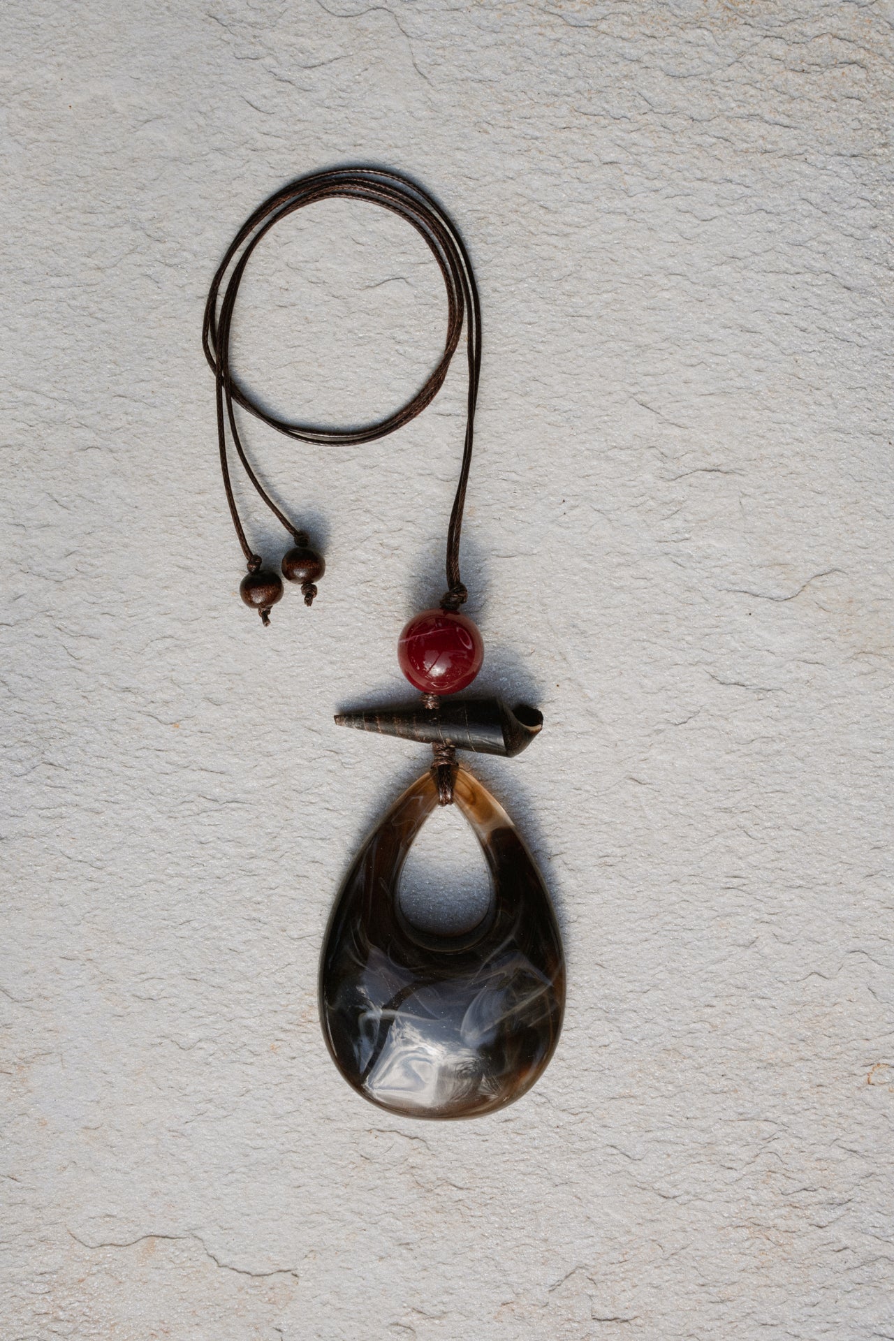 Cordão de fio encerado marrom com pingente de resina e concha natural