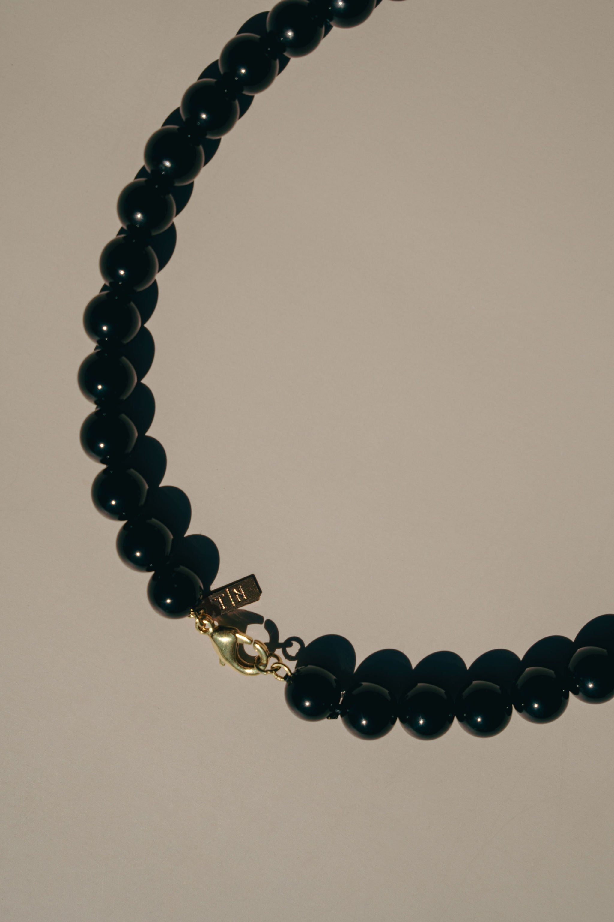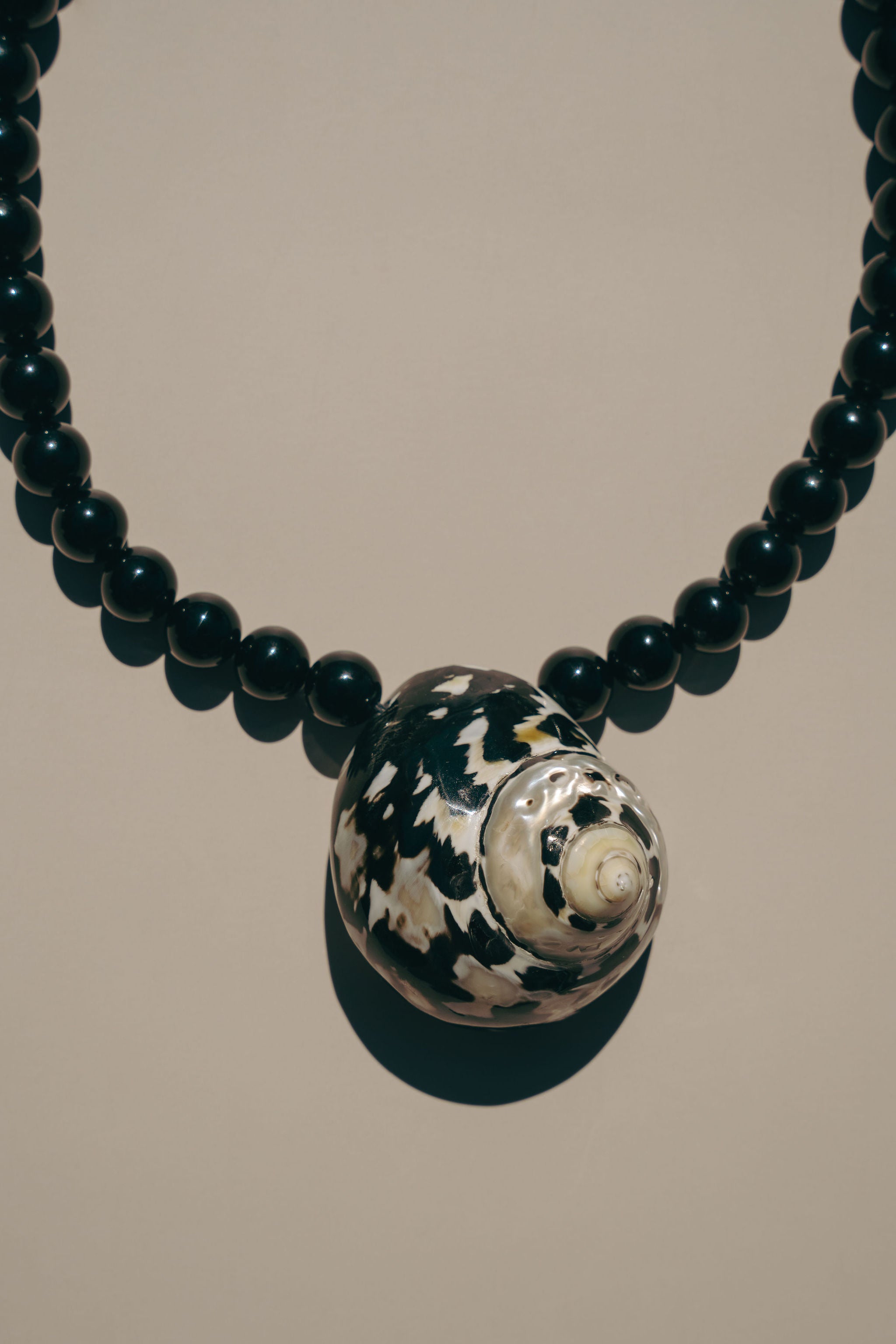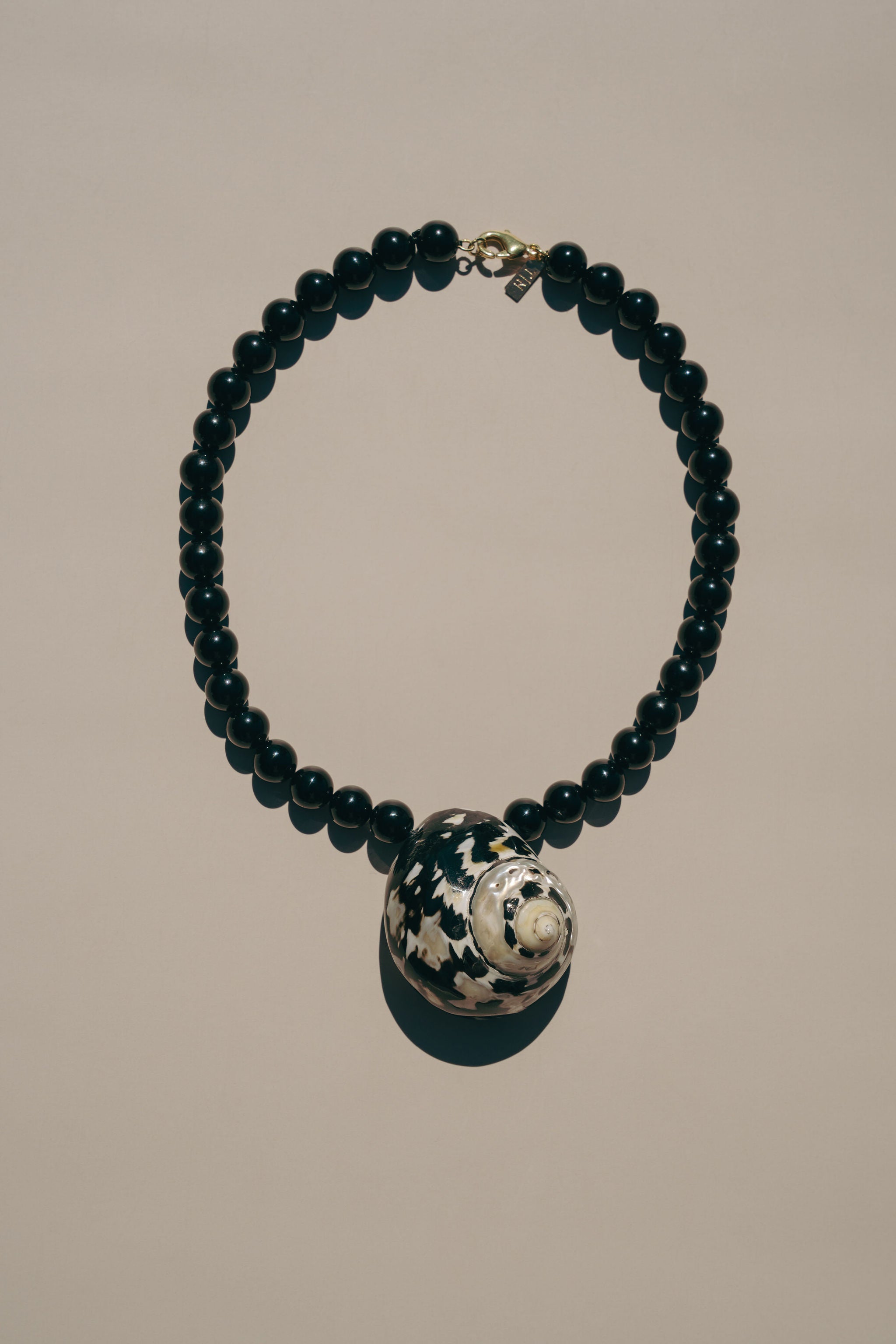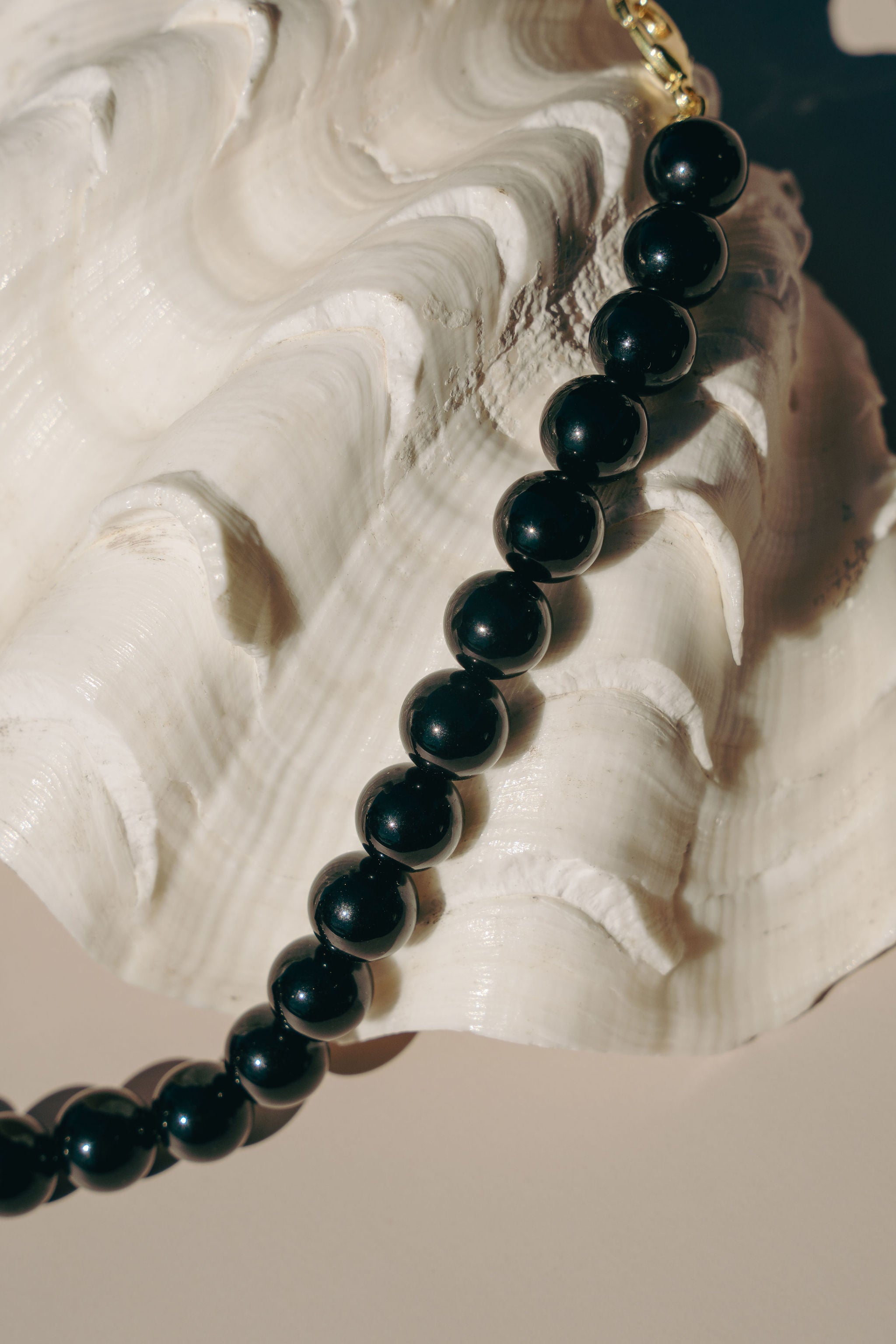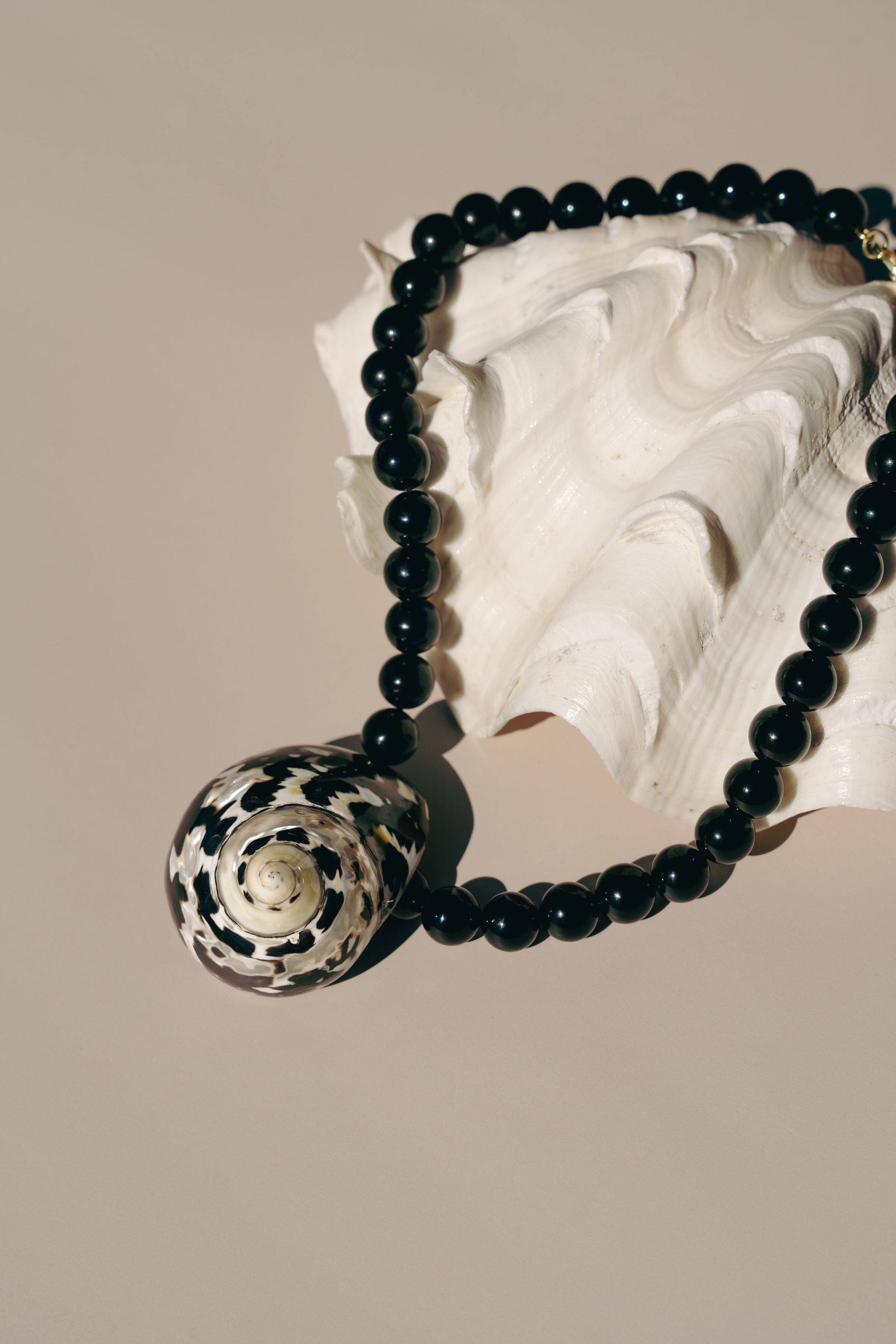 Colar de esferas de ônix negra de 10mm, concha natural e fecho com banho de ouro 18k.