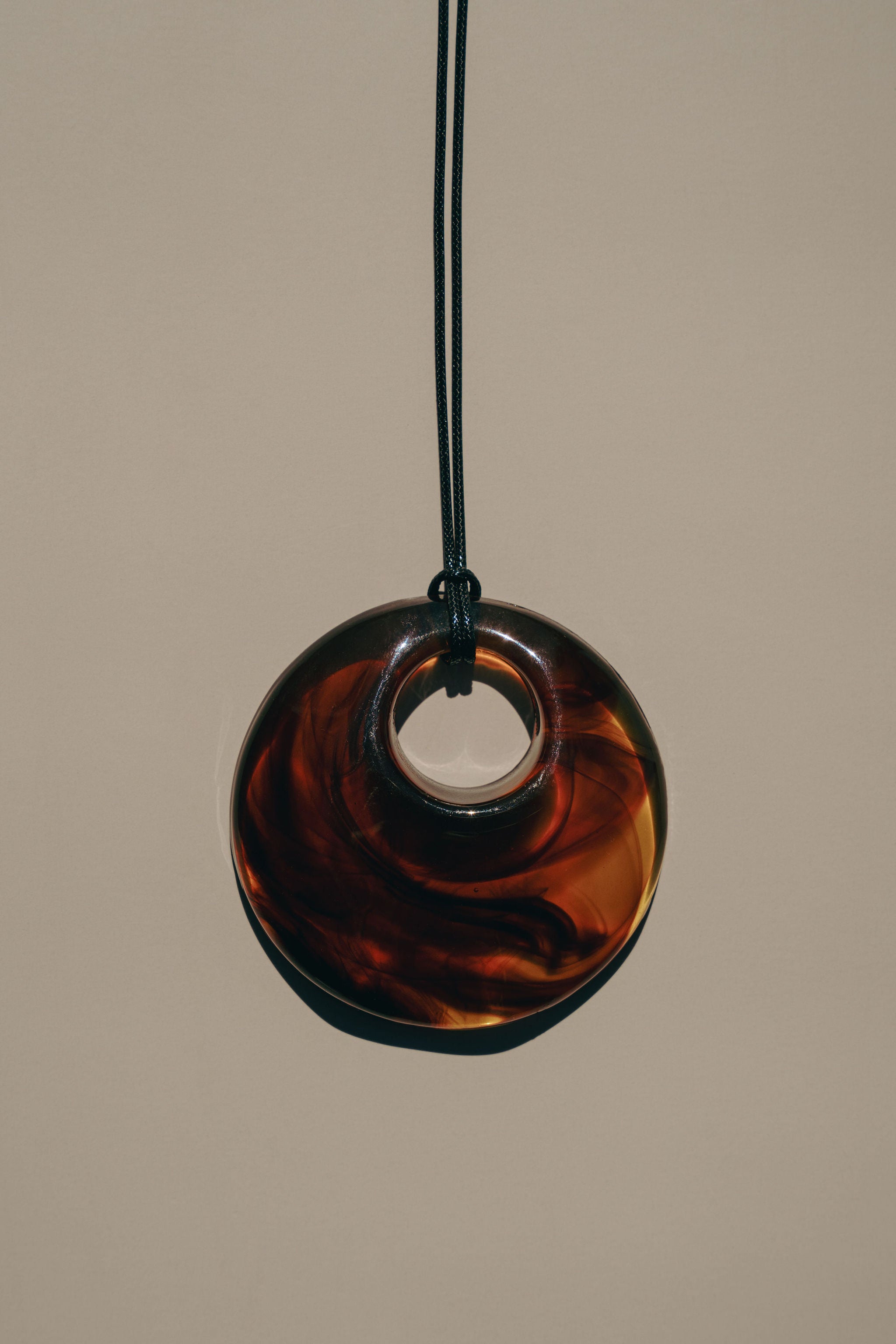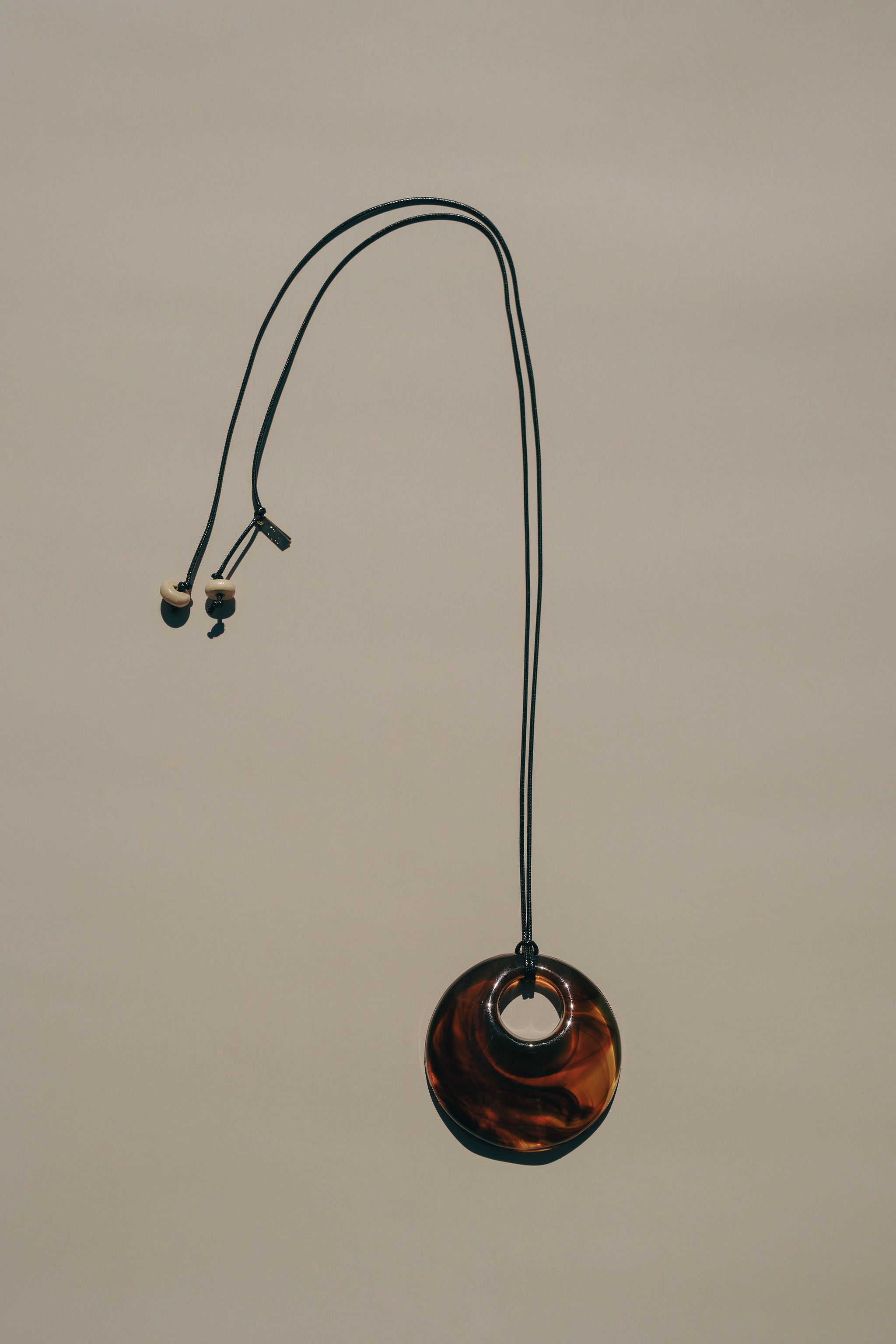 Cordão encerado marrom, pingente de resina mesclada, acabamento em madeira. Pode ser usado curto ou longo.
