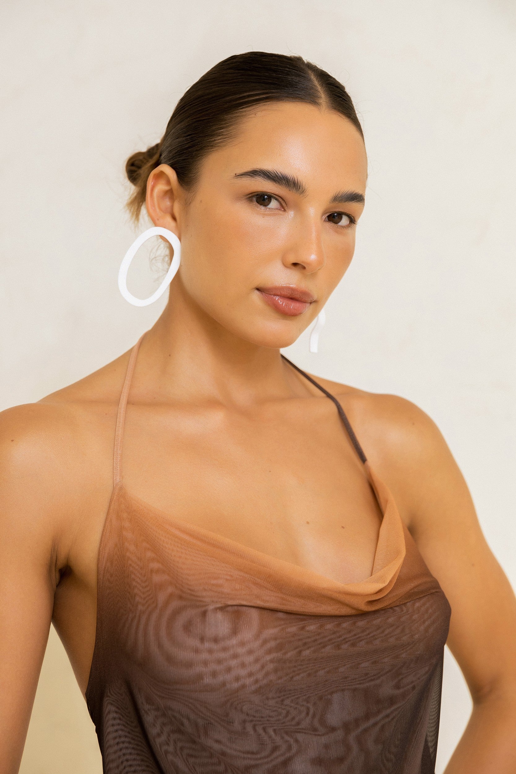 O Tule foi escolhido para refletir a delicadeza da luz do sol. O brilho sutil do tecido ganha força quando o sol incide sobre a peça, imitando os momentos de luz e sombra da vida. Ambos necessários. A transparência também representa nossa filosofia como marca, na qual sempre valorizamos as conexões incríveis criadas com nossas Free spirits.